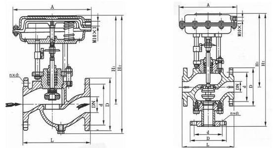 本系列產(chǎn)品有薄膜式、活塞式兩種。閥體結(jié)構(gòu)有單座、套筒、雙座(二位三通)三種,密封形式有填料密封和波紋管密封兩種,產(chǎn)品公稱壓力等級(jí)有PN10、16、40、64四種,公稱口徑范圍DN20~200mm。適用流體溫度由-60~450℃。泄漏量等級(jí)為IV級(jí)或Ⅵ級(jí)。流量特性為快開(kāi)。