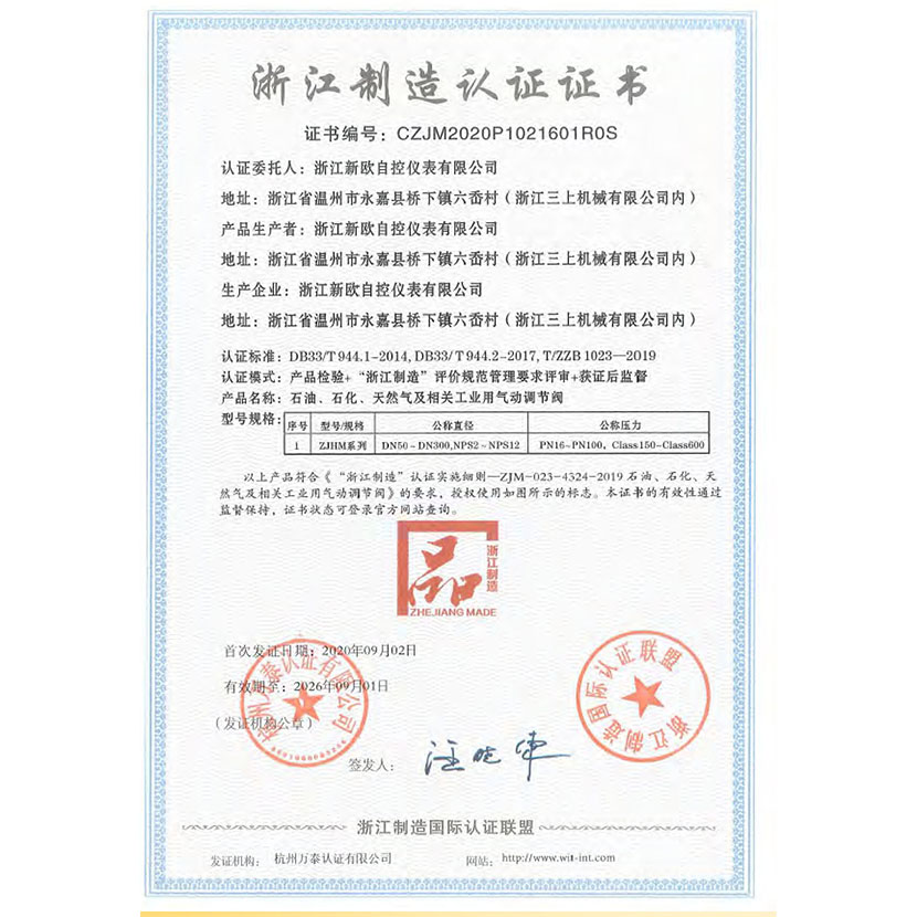 浙江制造認(rèn)證證書